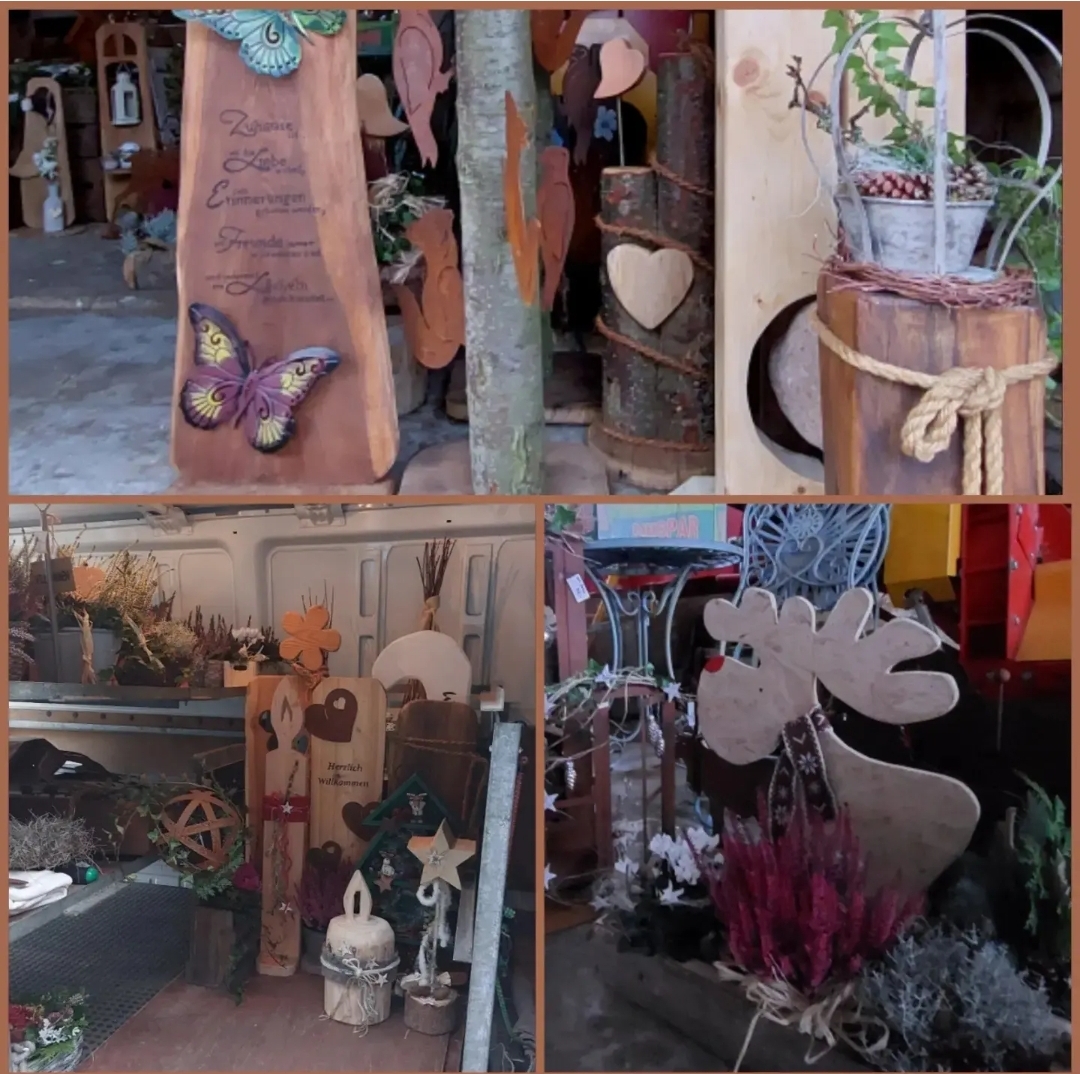 Kinderschminken, Drechsler, Deko aus Rostmetall, Tee, Schmied, Kaffee & Kuchen, Geflügel-Verlosung, Schmuck aus Besteck, Kinderbelustigung, Hofladen, Korbflechter, Met, Blumen-Deko, (Gin-) Brennerei, Essen & Trinken, Plott-Deko, Magnet-Schmuck, Kinderkleidung, Süßes, Schätzbude, Kinderkarussel, Grünkohl und noch vieles mehr…
